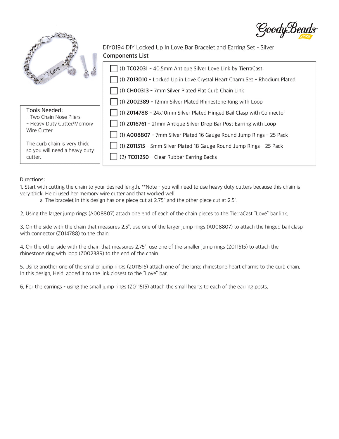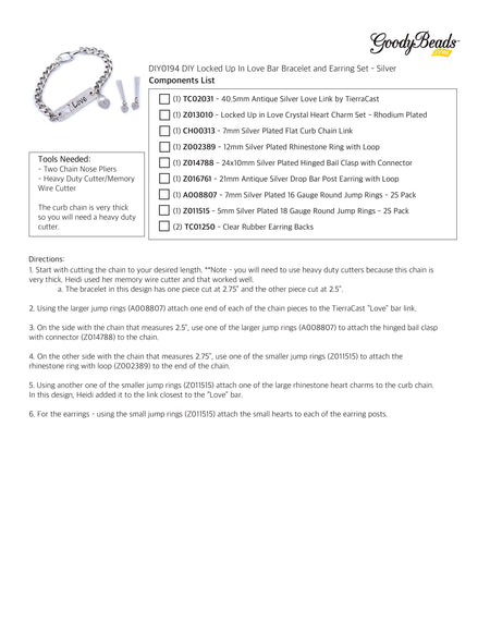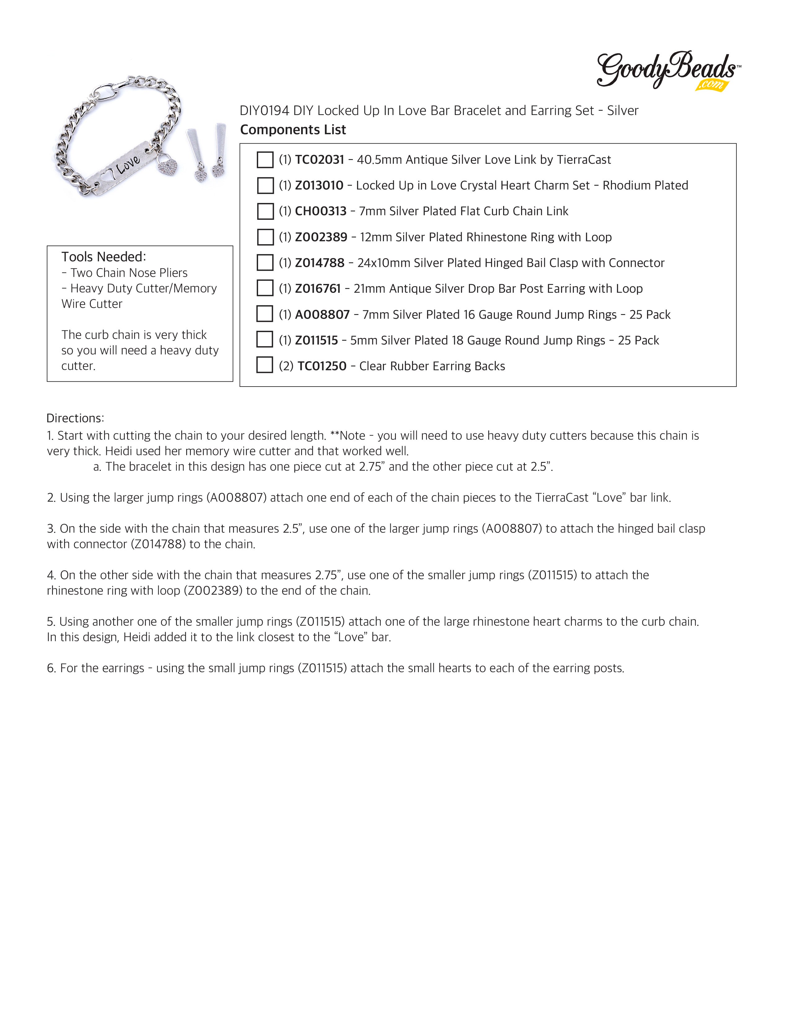 INSTRUCTIONS for DIY Locked Up In Love Bar Bracelet and Earring Set - Silver