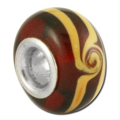 8x13mm rondelle large hole beads. These high quality beads fit perfectly on all of the popular brand name chains as well as our very own interchangeable bracelets, necklaces and bangles too. These beads have a translucent deep amber base with a great tan swirl pattern on them. The core of these large hole beads is silver plated over copper. Sold 3 per pack.