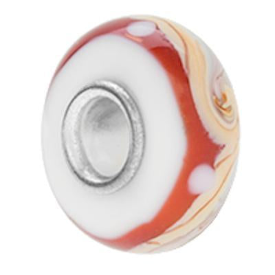 7x14mm rondelle large hole beads. Red caramel swirl is red on one side and blue on the other with caramel colored swirls. These beautiful Murano style beads fit perfectly on all of the popular brand name chains as well as our very own interchangeable bracelets, necklaces and bangles too. High quality solid core is silver plated over copper. Sold as 3 beads per pack.