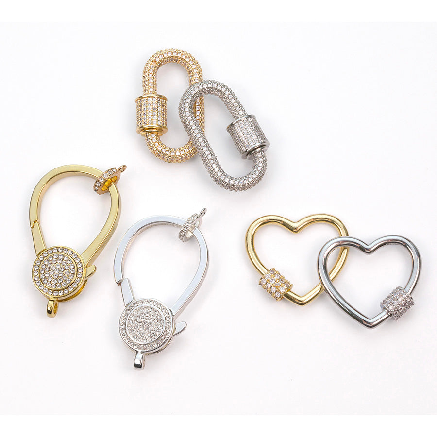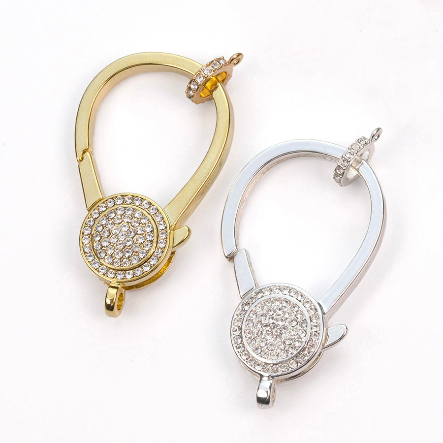 38mm Gold plated lobster clasp with rhinestones and coordinating rhinestone bail. Makes a great focal piece. Easily change out charms and pendants for an interchangeable piece of jewelry.